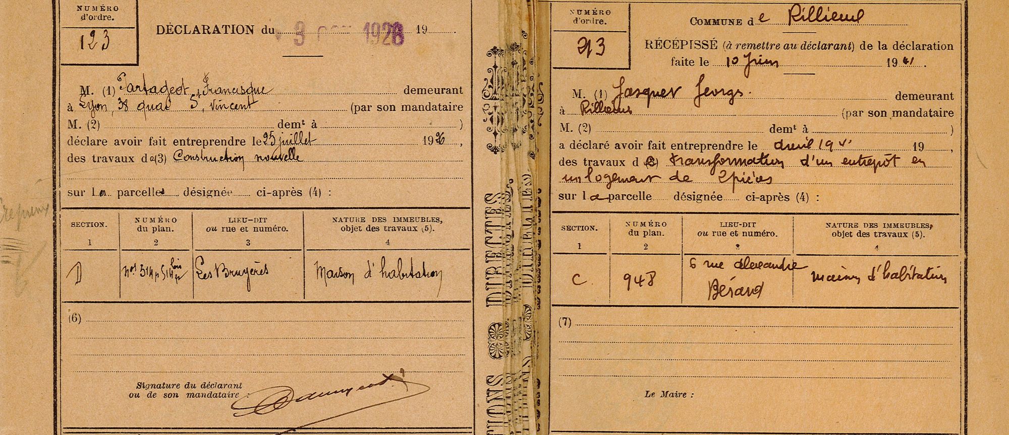 Ce visuel constitue un extrait du registre de déclarations des constructions nouvelles de la commune de Rillieux daté entre 1926 et 1941. Il s'agit de l'unique registre de cette catégorie inventorié pour la commune de Rillieux à cette période ; il en existe deux pour la commune de Crépieux-la-Pape.