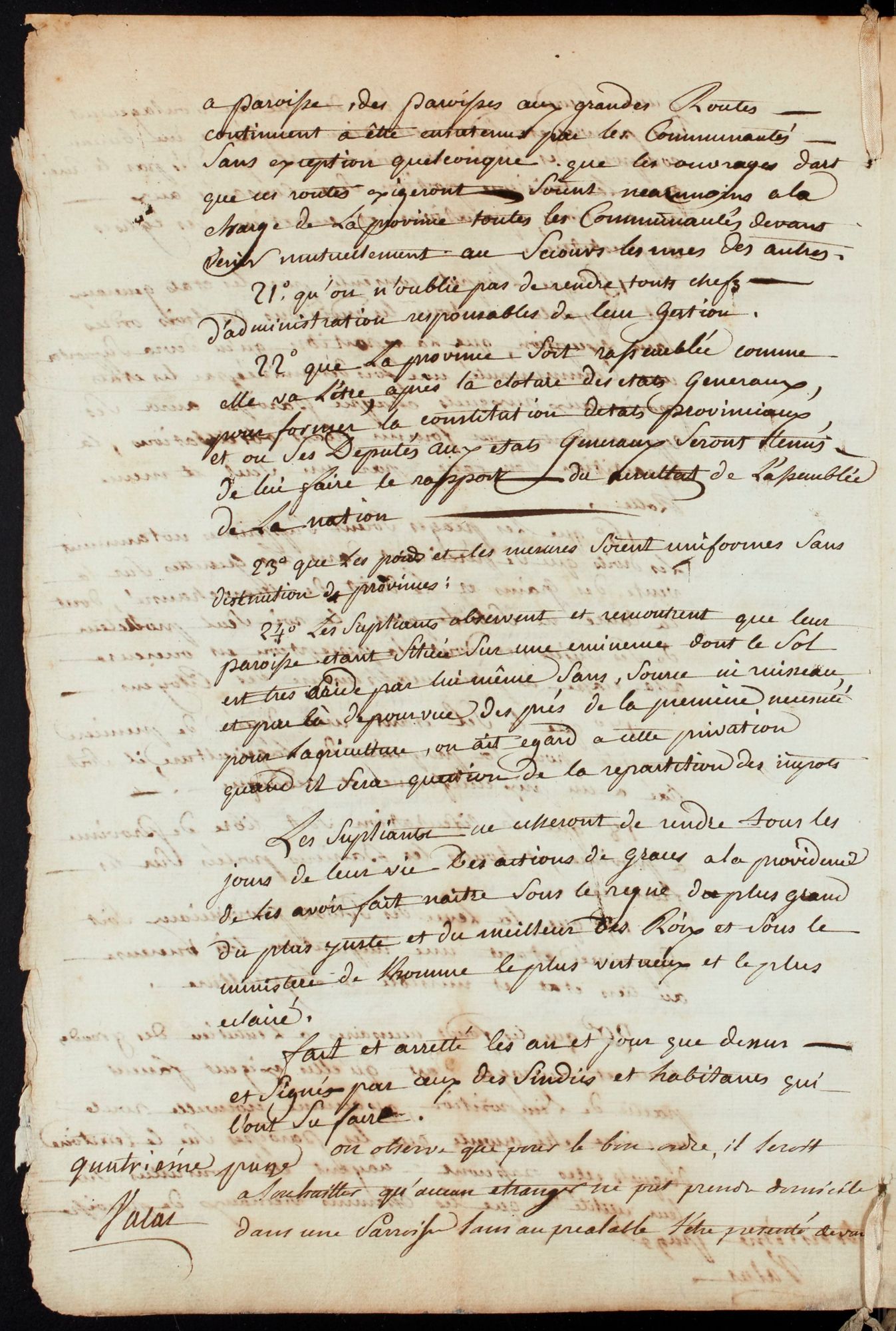 Cahier des doléances, plaintes et remontrances portées a l’assemblée des trois ordres de la paroisse a Bourg pour la convocation des Etats Généraux du 16 mars 1789