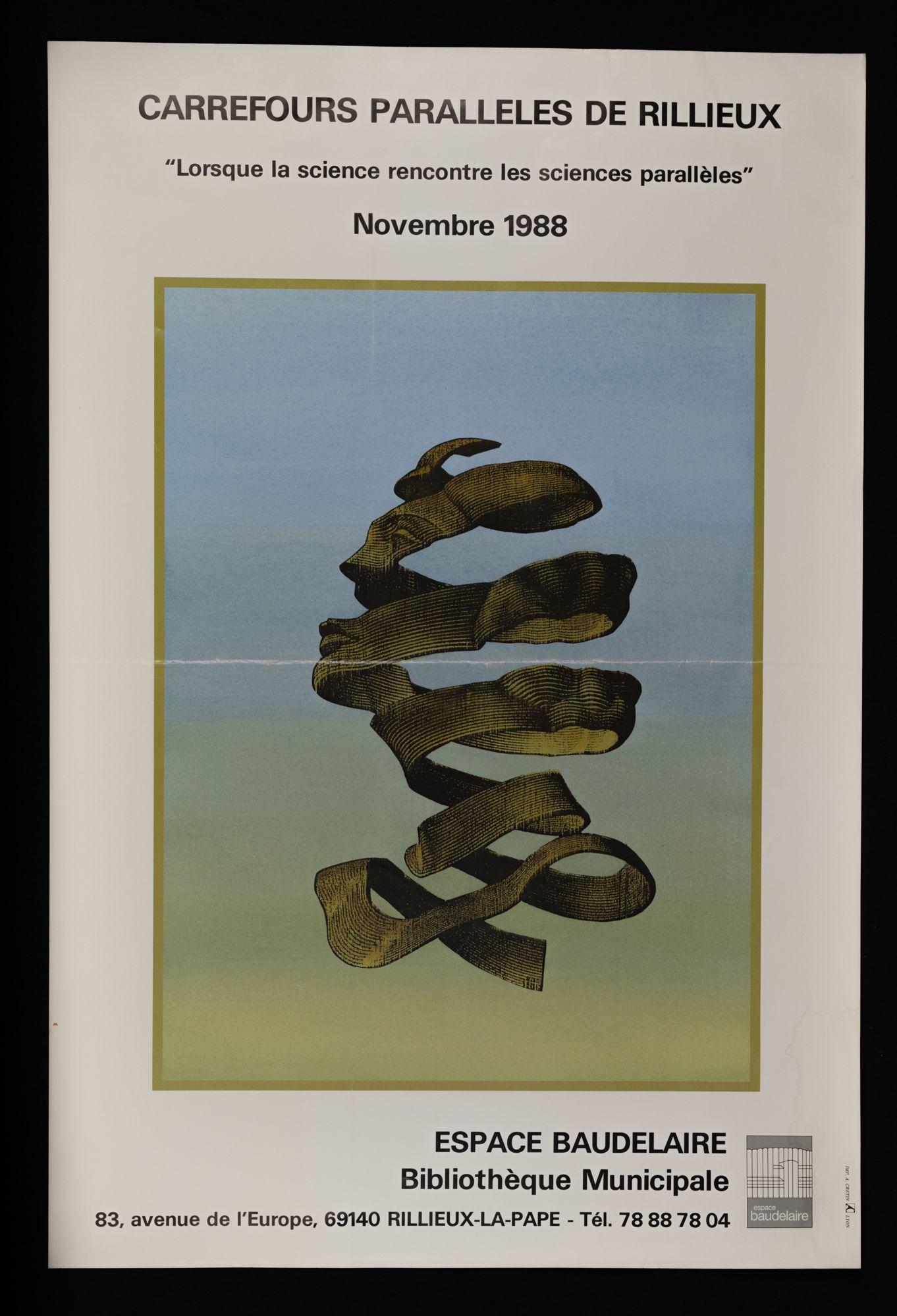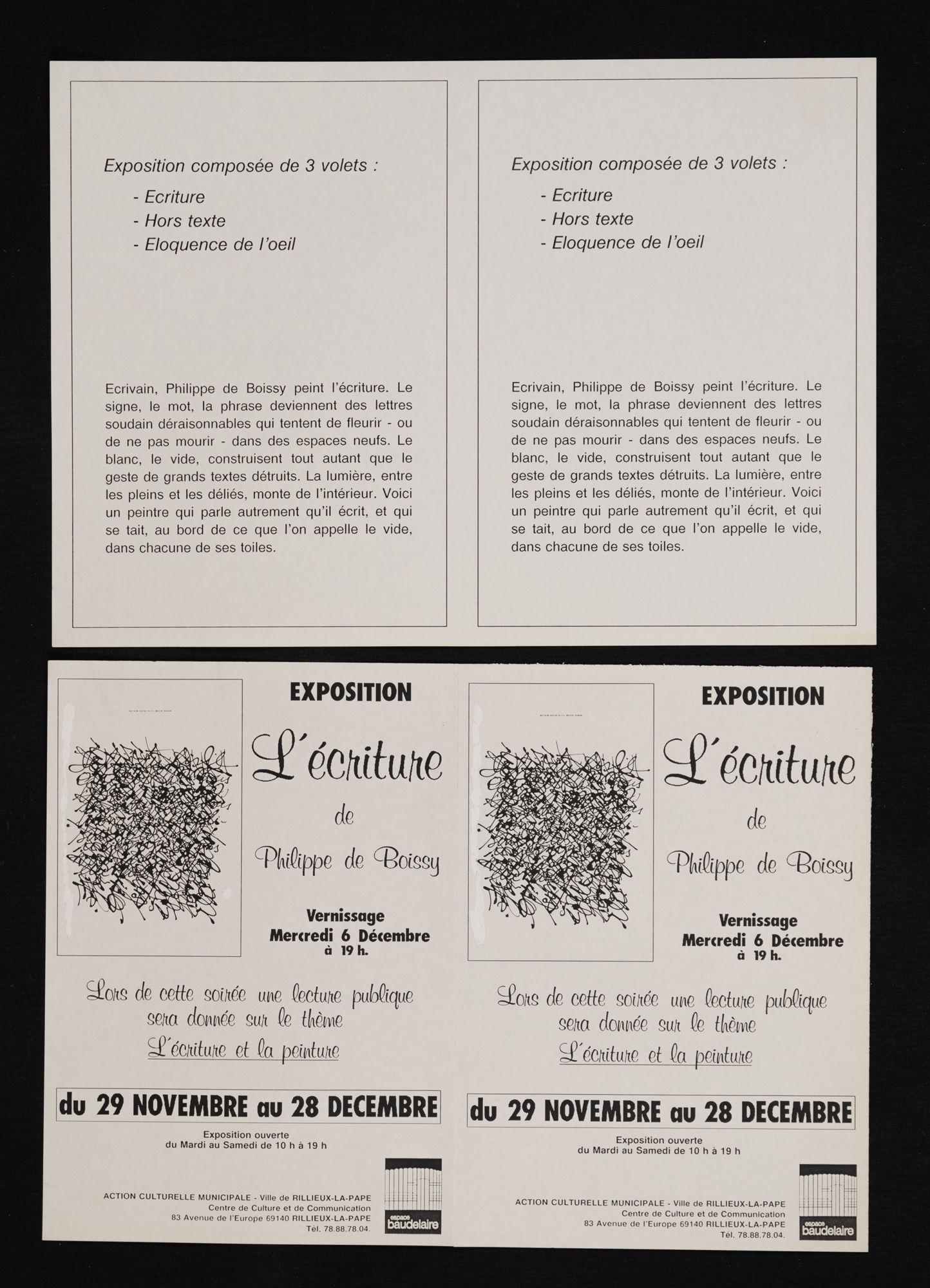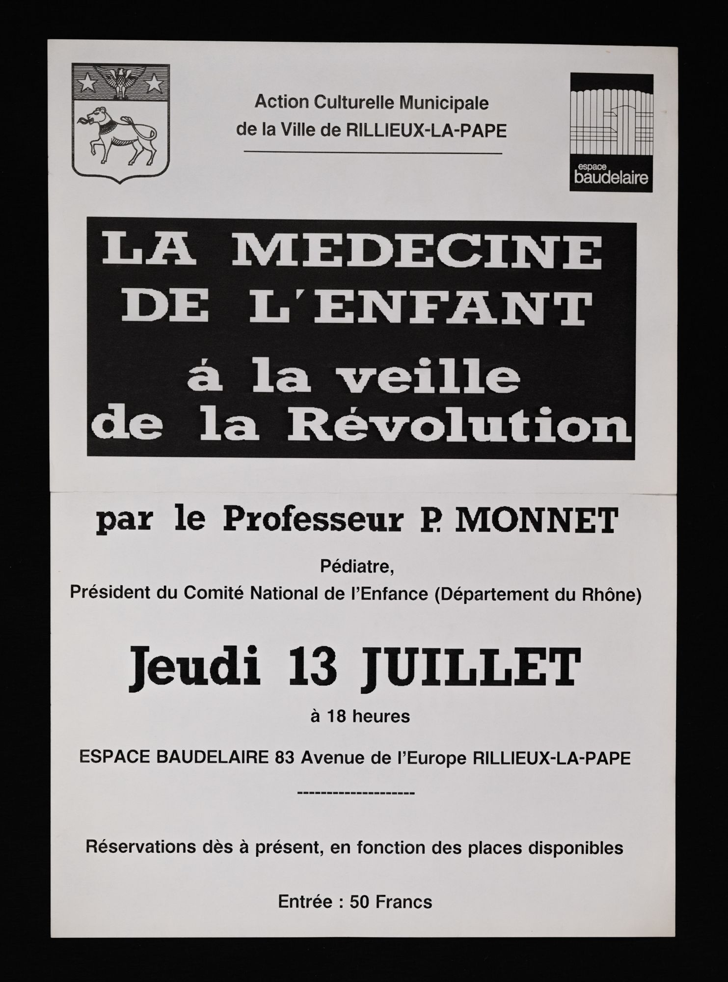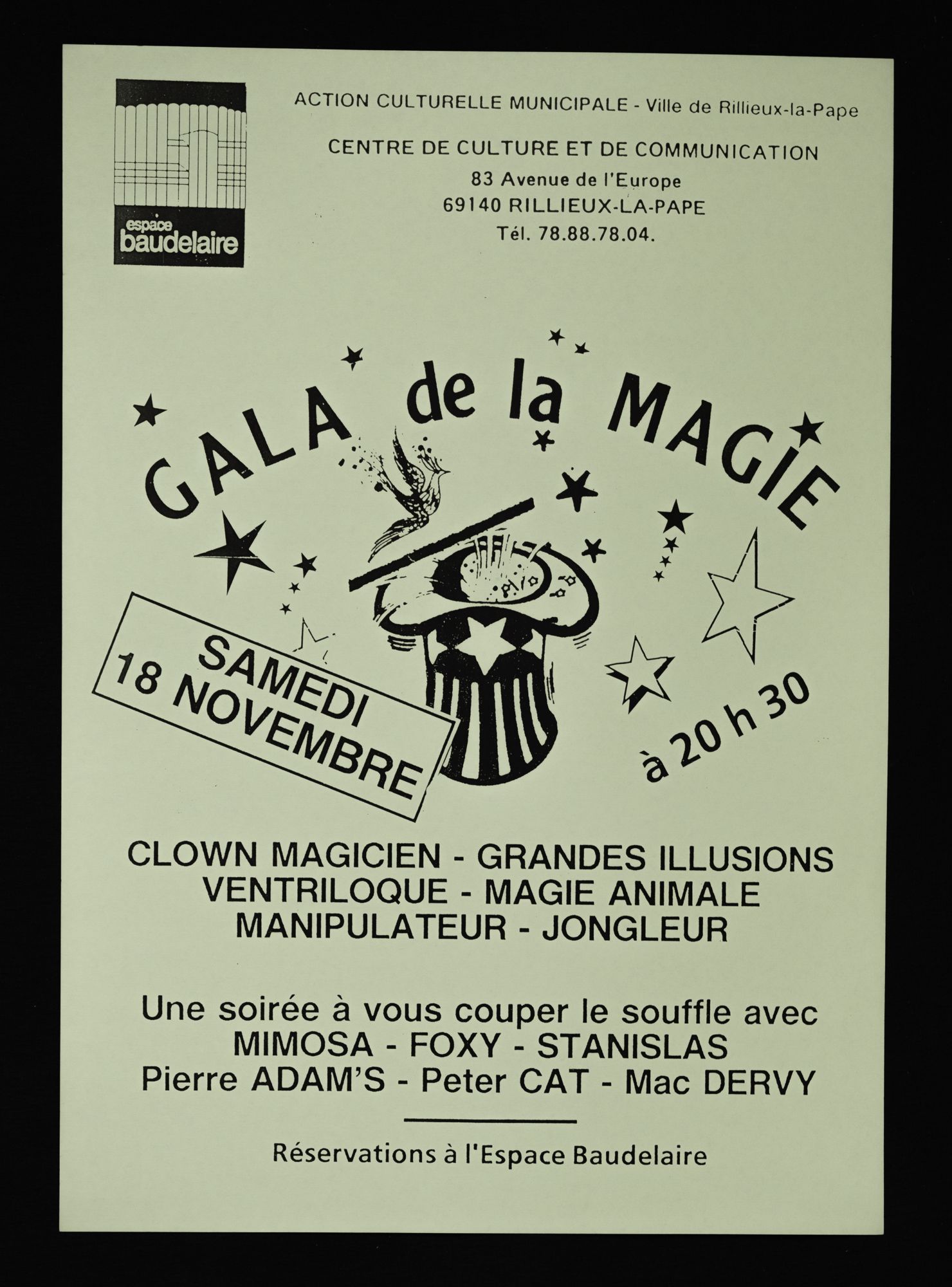 158W01 - Contact emploi, 2ème salon - 1986158W02 - Phèdre de Racine - 1987158W03 - 1ère foire d'art contemporain - 1987158W04 - Gala de la magie - 1988158W05 - "Lyon la Belle", dessins/pastels/huiles par Geneviève André - 1988158W06 - "Le grenier révolution, toutes les révolutions", "Denis Monnet, maître ouvier dans la tourmente révolutionnaire" - 1988158W07 - Photographies de Joël Guenot - 1989158W08 - Peintures de Anne Lutz et Camille Dandelot - 1989158W09 - Correspondances de Bruno Valera " - 1989158W10 - Carrefours parallèles de Rillieux, "losque la science rencontre les sciences parallèles" - 1988158W11 - "La medecine de l'enfant à la veille de la révolution" par le professeur P. Monnet - 1989158W12 - "Caractère ou le dix-septième miroir" mise en scèn par Martine Chifflot - 1989158W13 - "Contes populaire de tradition orale " par Césarr Gattegno - 1989158W14 - "Duo de musique des Andes avec deux musiciens de Los Chacos, Jean-Michel Cayre et Daniel Darmezin - 1989158W15 - "Steel Band" avec l'ensemble tropique du cancer - 1989158W16 - Gala de la magie - 1989158W17 - Grande exposition de modélisme ferroviaire - 1989158W18 - Affiche l'écriture de Philippe de Boissy, lecture publique - 1989158W18 - Flyer, l'écriture de Philippe de Boissy, lecture publique - 1989158W19 - "Marcel Pagnol, un merveilleux voyage en Pagnolie" - 1990158W20 - Festival de l'accordéon, gala-exposition en collaboration avec l'A.S.C.S - 1990