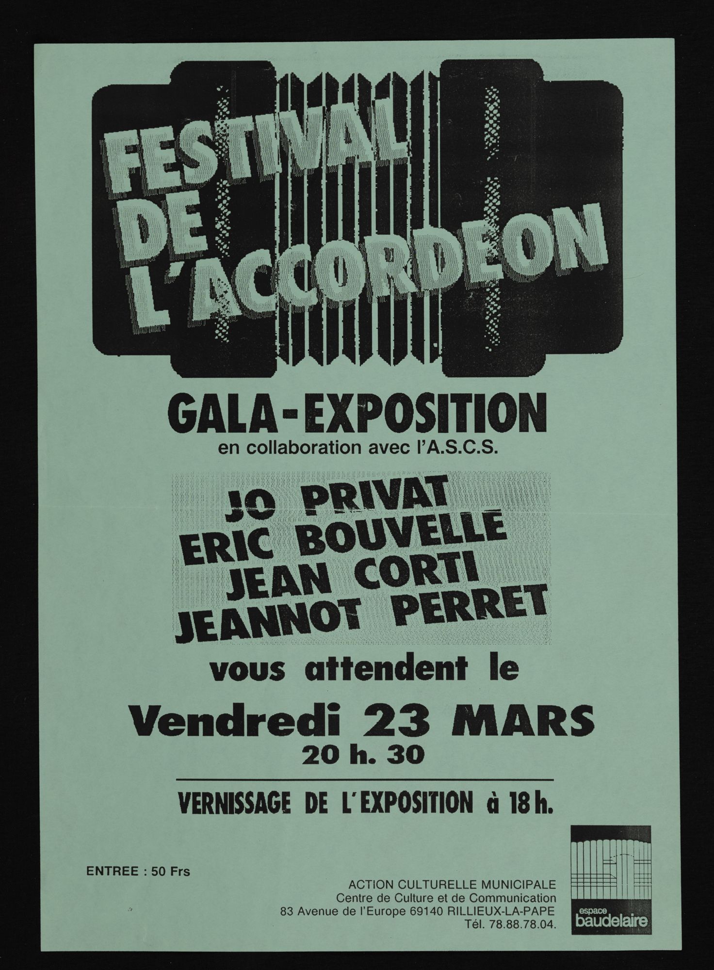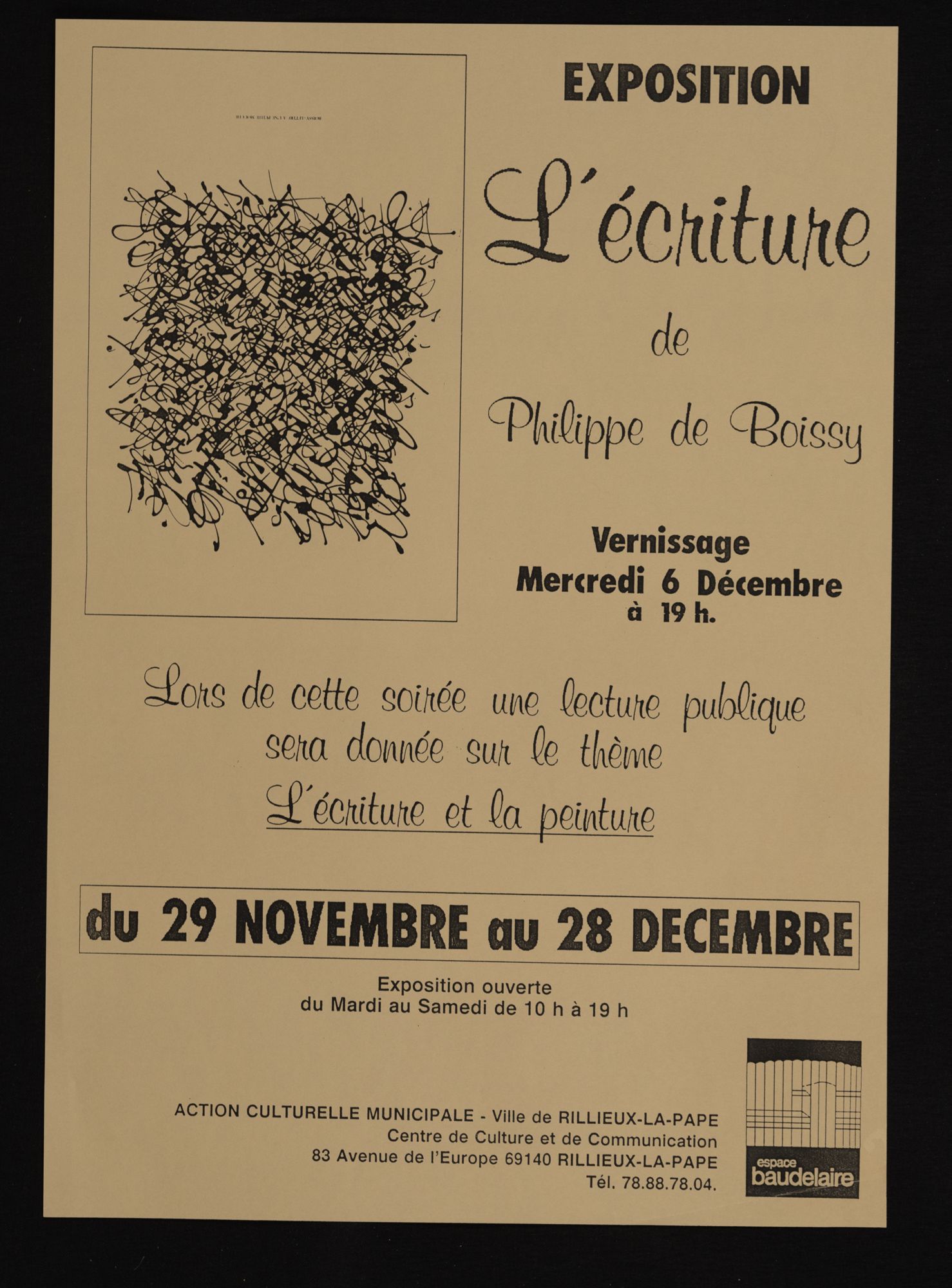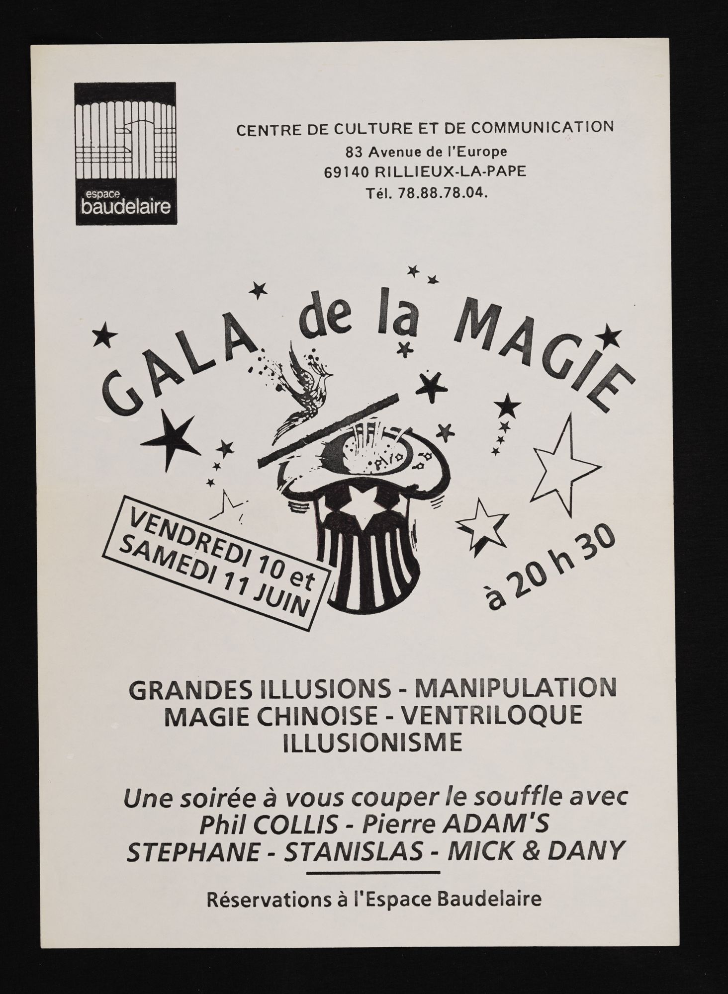 158W01 - Contact emploi, 2ème salon - 1986158W02 - Phèdre de Racine - 1987158W03 - 1ère foire d'art contemporain - 1987158W04 - Gala de la magie - 1988158W05 - "Lyon la Belle", dessins/pastels/huiles par Geneviève André - 1988158W06 - "Le grenier révolution, toutes les révolutions", "Denis Monnet, maître ouvier dans la tourmente révolutionnaire" - 1988158W07 - Photographies de Joël Guenot - 1989158W08 - Peintures de Anne Lutz et Camille Dandelot - 1989158W09 - Correspondances de Bruno Valera " - 1989158W10 - Carrefours parallèles de Rillieux, "losque la science rencontre les sciences parallèles" - 1988158W11 - "La medecine de l'enfant à la veille de la révolution" par le professeur P. Monnet - 1989158W12 - "Caractère ou le dix-septième miroir" mise en scèn par Martine Chifflot - 1989158W13 - "Contes populaire de tradition orale " par Césarr Gattegno - 1989158W14 - "Duo de musique des Andes avec deux musiciens de Los Chacos, Jean-Michel Cayre et Daniel Darmezin - 1989158W15 - "Steel Band" avec l'ensemble tropique du cancer - 1989158W16 - Gala de la magie - 1989158W17 - Grande exposition de modélisme ferroviaire - 1989158W18 - Affiche l'écriture de Philippe de Boissy, lecture publique - 1989158W18 - Flyer, l'écriture de Philippe de Boissy, lecture publique - 1989158W19 - "Marcel Pagnol, un merveilleux voyage en Pagnolie" - 1990158W20 - Festival de l'accordéon, gala-exposition en collaboration avec l'A.S.C.S - 1990