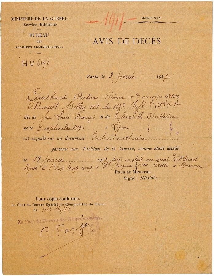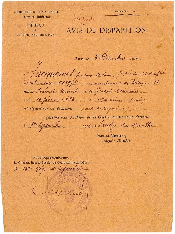 Lorsqu’un soldat décède en service, soit au combat, soit dans un des nombreux hôpitaux militaires provisoires, l’administration militaire rédige un acte afin de constater et rendre officiel le décès. L’information est ensuite transmise par voie postale à la commune où était domicilié le défunt. L’annonce du décès à la famille revient en général au maire de la commune ou aux personnes qu’il délègue.