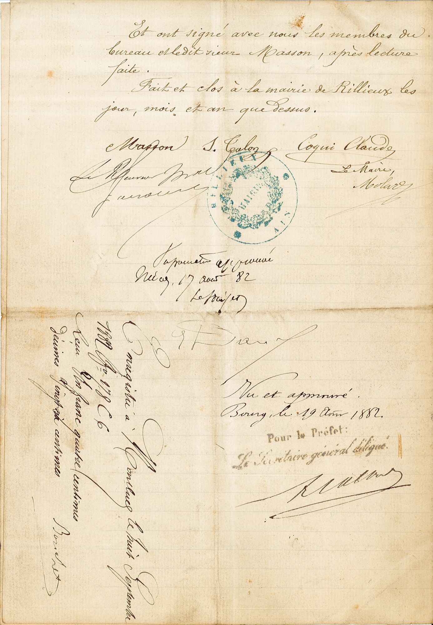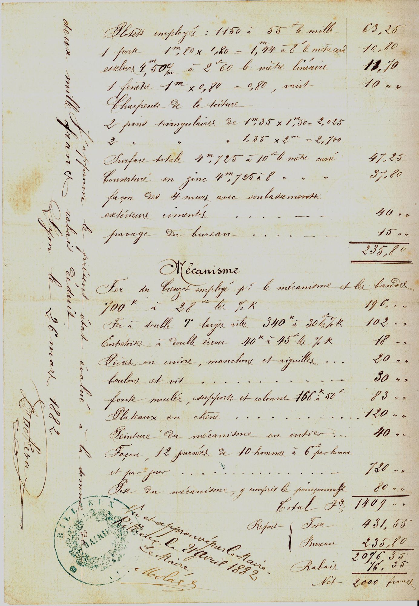 C'est par une délibération du 10 janvier 1882 que le conseil municipal décide de l'achat d'un pont à bascule et du pavillon devant abriter le bureau du peseur. On peut donc estimer la date de l'archive du mois à une période allant de janvier à août 1882. La dépense totale s'élève à deux mille francs pour la construction du pavillon, de la fosse et du mécanisme du pont à bascule.