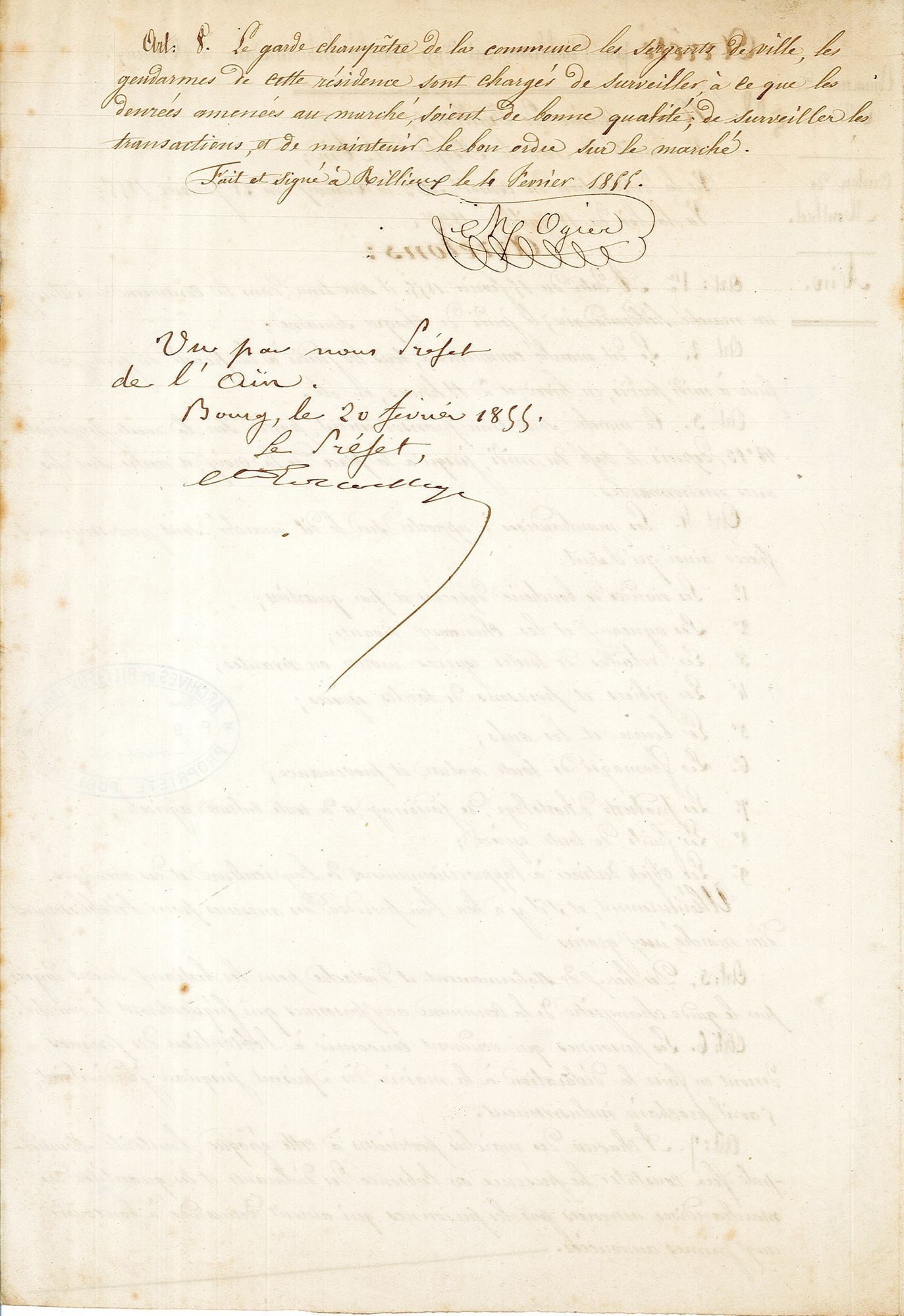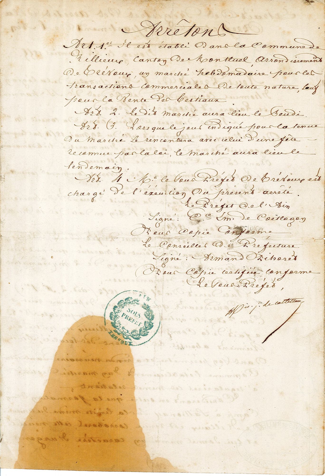 De nos jours, c'est au conseil municipal que revient la décision de création, transfert ou suppression de marchés communaux selon l'article L2224-18 du Code général des collectivités territoriales. Il n'en a pourtant pas toujours été ainsi. En effet, on peut constater sur cette affiche que la décision première revient au préfet de l'Ain.