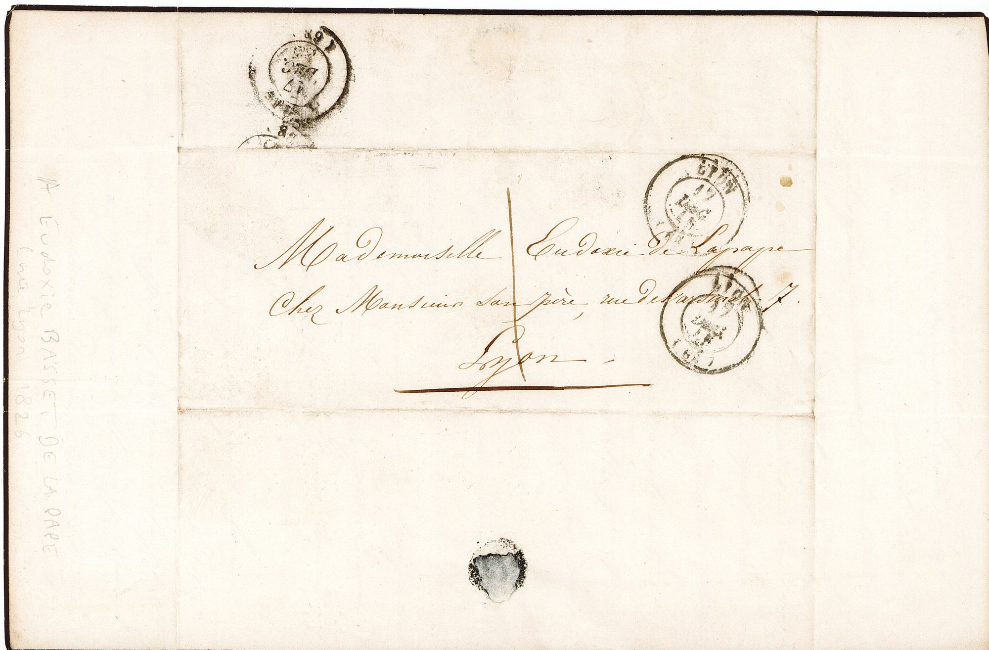 L'expéditrice de cette lettre est Séraphine PERRESVE (1799-1856) et la destinataire Elisabeth Caroline dite "Edoxie" BASSET DE LA PAPE (née en 1826, mariée à Alexandre Julien Anne Marie Joseph Gaëtan BRACORENS de SAVOIROUX en 1846 et sûrement décédée après 1854).
