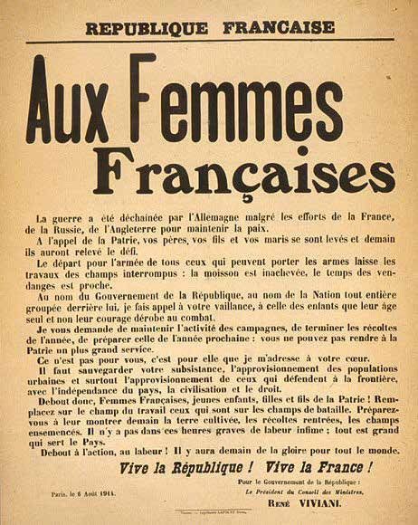 Dès le 7 août 1914, le Président du Conseil Viviani fait appel aux femmes pour assurer les récoltes. Suite au départ des hommes au front en pleine moisson et avant les vendanges, il est essentiel pour assurer la subsistance de la Nation que les femmes et les enfants assument la récolte des productions agricoles.