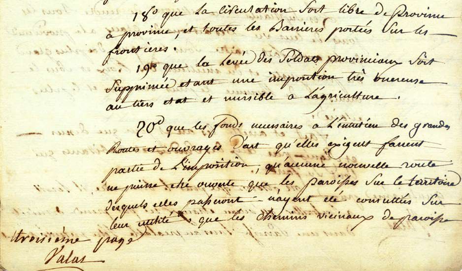 20° que les fonds nécessaires à l’entretien des grandes routes et ouvrages d’art qu’elles exigent fassent partie de l’imposition, qu’aucune nouvelle route ne puisse être ouverte que les paroisses sur le territoire desquels elles passeront n’ayent été consultées sur leur utilité, que les chemins vicinaux de paroisse à paroisse, des paroisses aux grandes routes continuent à être entretenus par les communautés sans exception quelconque, que les ouvrages d’art que ces routes exigeront soient néanmoins à la charge de la province toutes les communautés devant venir mutuellement au secours les unes des autres.»