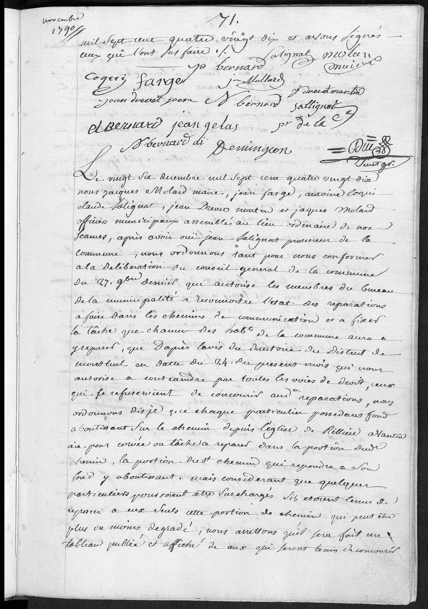 «Le vingt six décembre mil sept cent quatre vingt dix nous Jacques Molard maire, Jean Farge, Antoine Coqui, Claude Salignat, Jean Drevet, Martin et Jaques Molard officiers municipaux assemblés au lieu ordinaire de nos séances, après avoir ouï Jean Salignat procureur de la commune, nous ordonnons tant pour nous conformer à la délibération du conseil général de la commune du 27 novembre dernier qui autorise les membres du bureau de la municipalité à reconnoitre l’état des réparations à faire dans les chemins de communication et à fixer la tâche que chacun des habitants de la commune aura à préparer, que d’après l’avis du directoire du District de Montluel en datte du 24 du présent mois qui nous autorise à contraindre par toutes les voies de droit, ceux qui se refuseroient de concourir auxdites réparations, nous ordonnons dis je que chaque particulier possédant fond aboutissant sur le chemin depuis l’église de Rillieu à Vantia aie pour corvée ou tâche à réparer dans la portion dudit chemin, la portion dudit chemin qui répondra à son fond y aboutissant.