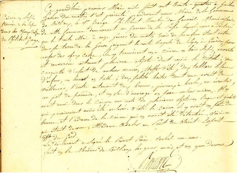 «Ce jourd’hui premier mai mil huit cent trente-quatre à huit heures du matin s’est présenté par devant nous maire de la commune de Rillieux, le sieur Grange Philibert membre du Conseil municipal de cette commune demeurant au hameau de la Pape lequel nous a déclaré que le trente mai à onze heures du matin trois de ses enfants étant entrés dans sa terre de la herse joignant la route royale de Lyon à Genève pour couper des choux colza, ils y trouvèrent une caisse en bois sapin ouverte et renversée contenant plusieurs objets dont voici le détail : une casquette d’enfant couleur marron, étoffe d’été, deux tabliers blancs d’enfants, un bonnet en tulle ; deux petites boîtes dont une avaient des veilleuses ; l’autre contenait deux brosses, pinceaux à barbe, un éventail, un pot de pommade, et un sac d’ouvrage en peau couleur marron. Il y avait aussi dans la caisse une note de plusieurs objets en linge et habits qui paraissaient avoir été enlevés. A côté la caisse il y avait un pot de beurre, et l’adresse de la caisse qui en avait été détachée. Voici ce qui était dessus : madame Adeler au pont du Saint Esprit département du Gard.