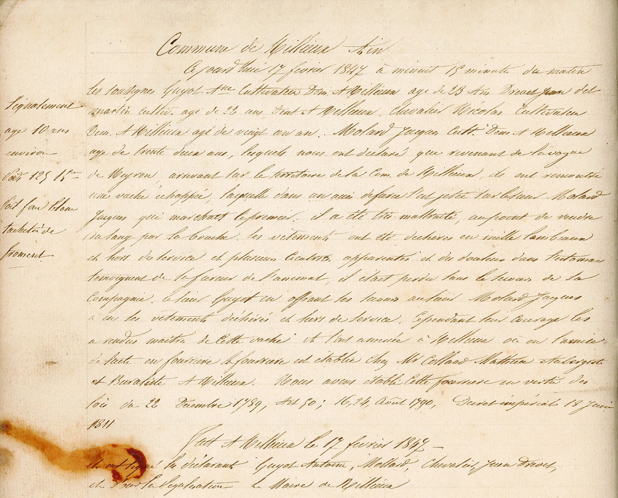 «Ce jourd’hui 17 février 1847 à minuit 15 minutes du matin les soussignés Guyot Antoine cultivateur demeurant à Rillieux âgé de 23 ans ; Drevet Jean dit Martin cultivateur âgé de 22 ans demeurant à Rillieux, Chevalier Nicolas cultivateur demeurant à Rillieux âgé de vingt-et-un an, Molard jacques cultivateur demeurant à Rillieux âgé de trente deux ans, lesquels nous ont déclaré que revenant de la vogue de Neyron, arrivant sur le territoire de la commune de Rillieux, ils ont rencontré une vache échappée, laquelle dans un accès de furie s’est jetée sur le sieur Molard Jacques qui marchait le premier.