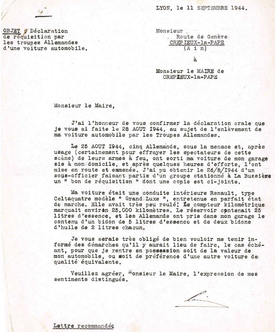 D’après certaines informations je dois adresser une déclaration en double exemplaire, soit une à la Mairie de Crépieux, une autre à la Préfecture de Bourg, pour les dégâts occasionnés par l’occupant. Lors de l’occupation des Allemands, ces derniers m’ont pris un vélo, état neuf, marque Reinor, le reçu a bien été demandé, pour toute réponse, mitraillette sous le nez, de plus lors du bombardement, j’ai eu le toit du garage détruit, 50 tuiles environ et plusieurs lambourdes, à ma maison, volet fer détérioré, vitres cassées, plafond effondré, gros trous de part et d’autre dans la façade, maison fissurée.