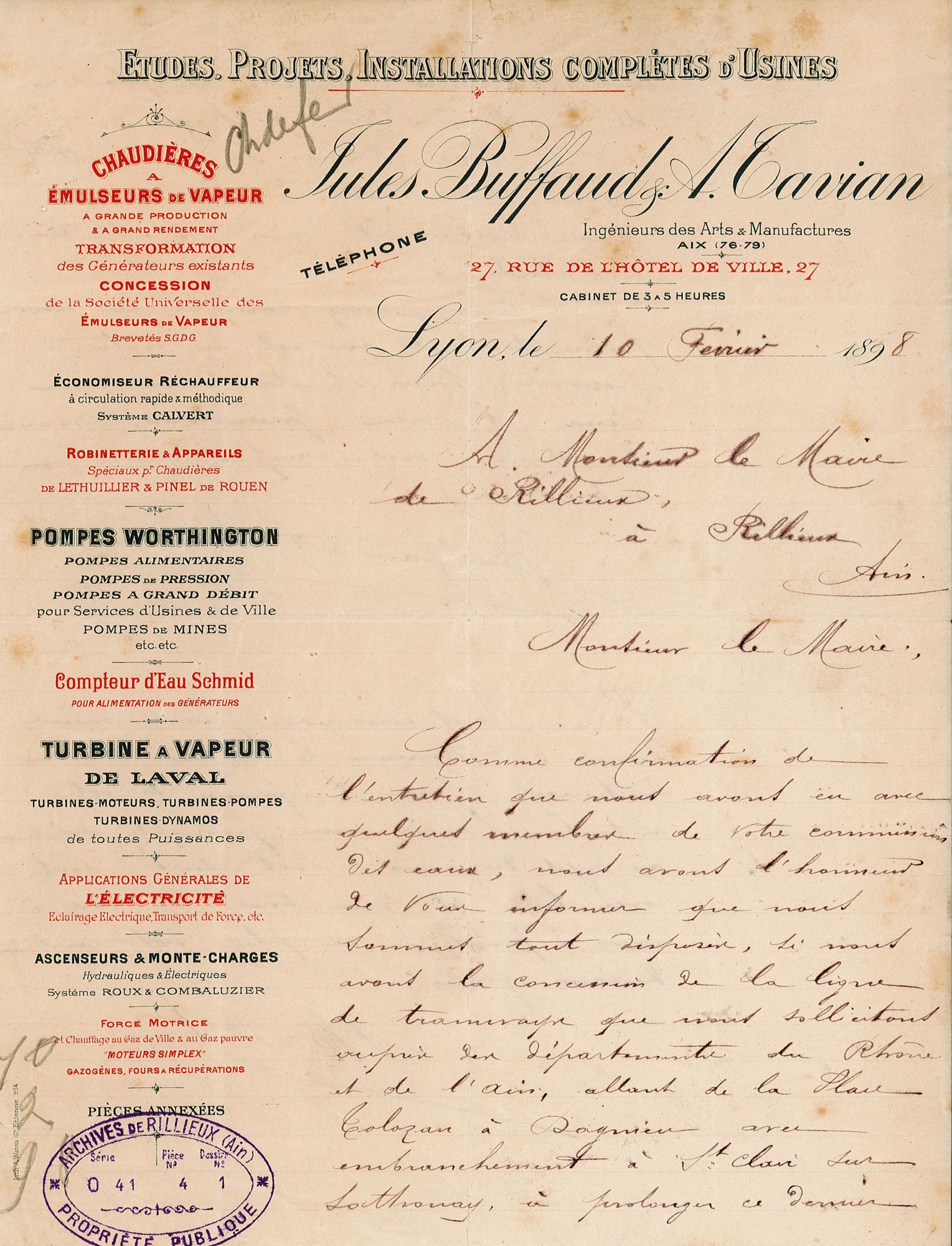 Néanmoins, le choix de la concession de la ligne à l’OTL n’était pas une évidence. D’autres compagnie avait sollicité le Maire de Rillieux, dès les années 1890, pour obtenir la concession de la ligne. En 1898, Buffaud et Tavian s’engageaient ainsi à construire un prolongement de la ligne jusqu’à la mairie de Rillieux, s’ils obtenaient la concession.