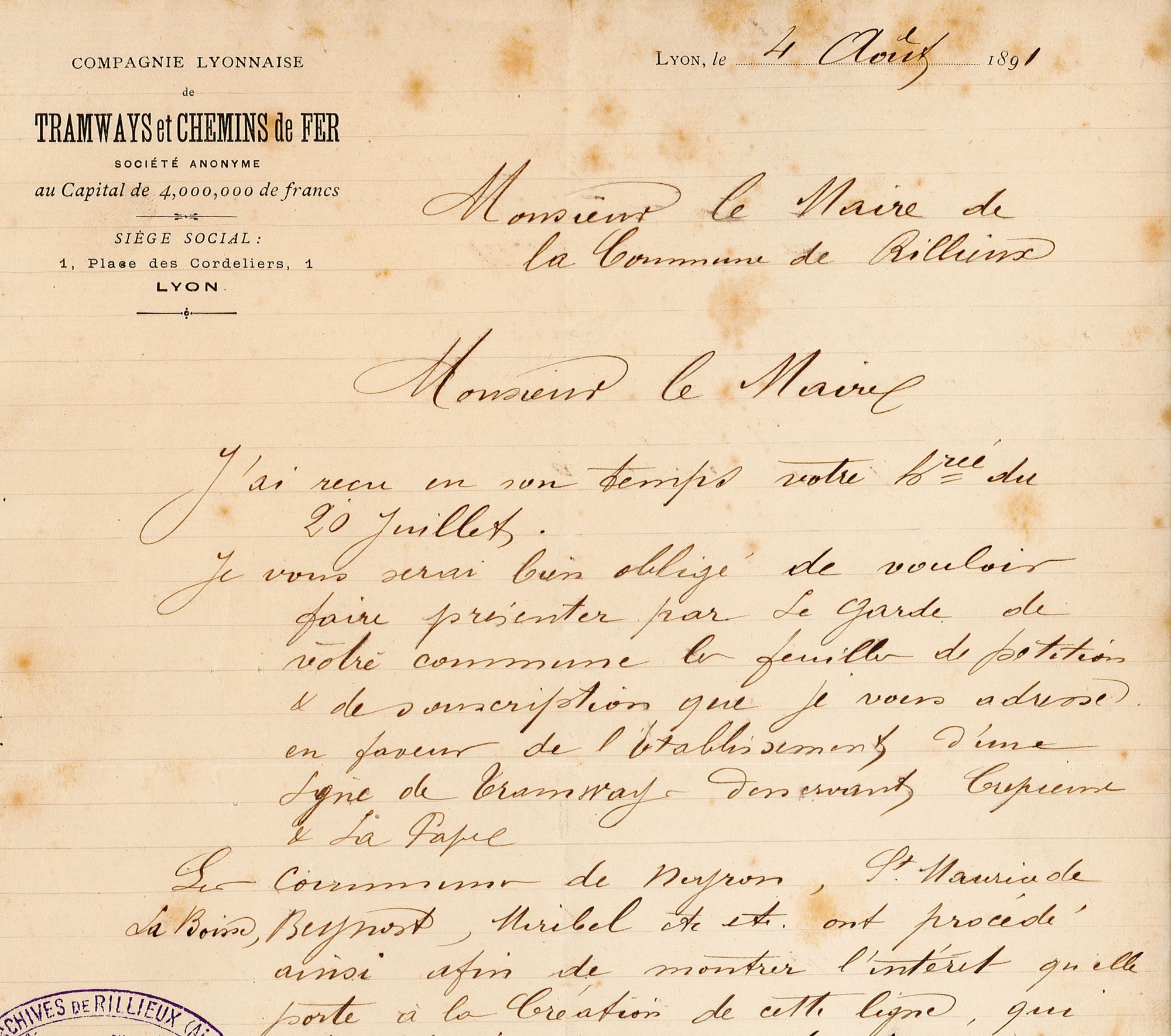 Le tramway, d’après le Conseil municipal, est même l’une des conditions de survie de la vie économique du village. Dans la séance du 18 septembre 1938, les élus déplorent l’absence d’abonnement ouvrier, le prix excessif des billets. Le conseil affirme que ces tarifs incitent des familles à quitter Rillieux, et sont préjudiciables au commerce.